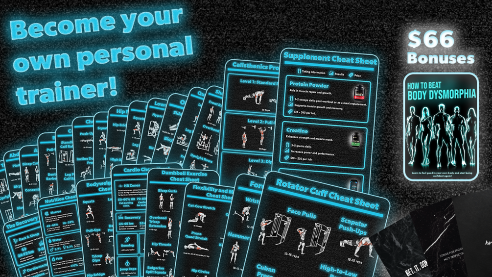 Researching, fact-checking, and designing is a long and tedious process. We have spent hours compiling the best exercises and the most important information to improve your fitness experience. For just $10 per cheatsheet, they are a relative steal compared to the time and effort spent making them. Just one tip in there could save you months of training the wrong way. But we decided to give back to the fitness community and offer not only a 35% discount on the fitness cheatsheets but also include the "How to Beat Body Dysmorphia" eBook and 30 Maximum Gains Wallpapers completely FREE. This means you can currently get everything for just $150!