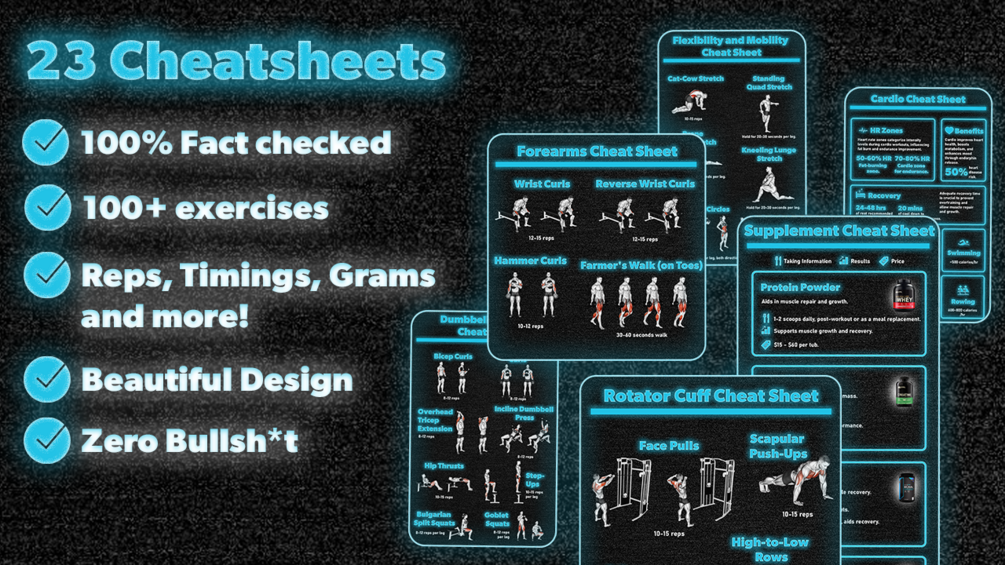 We have frustrated ourselves so you don't have to. This bundle of 23 Fitness Cheat Sheets has the information you need, when you need it. No more time wasted searching, just the thing you want to know. All are Fact checked, beautiful designed and clear so that you find what you need in mere seconds.
